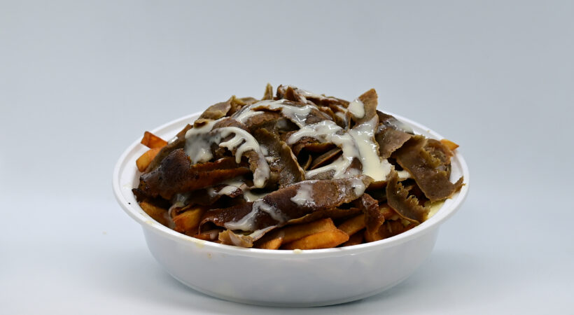 French Fries, cheese topped with a gravy and topped with beef donair and sweet sauce.